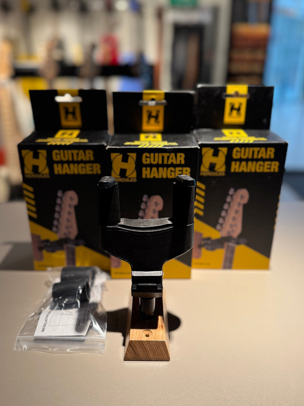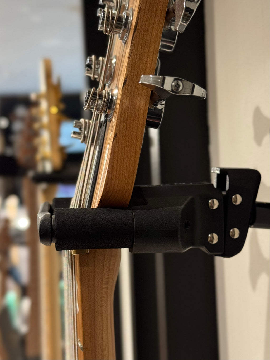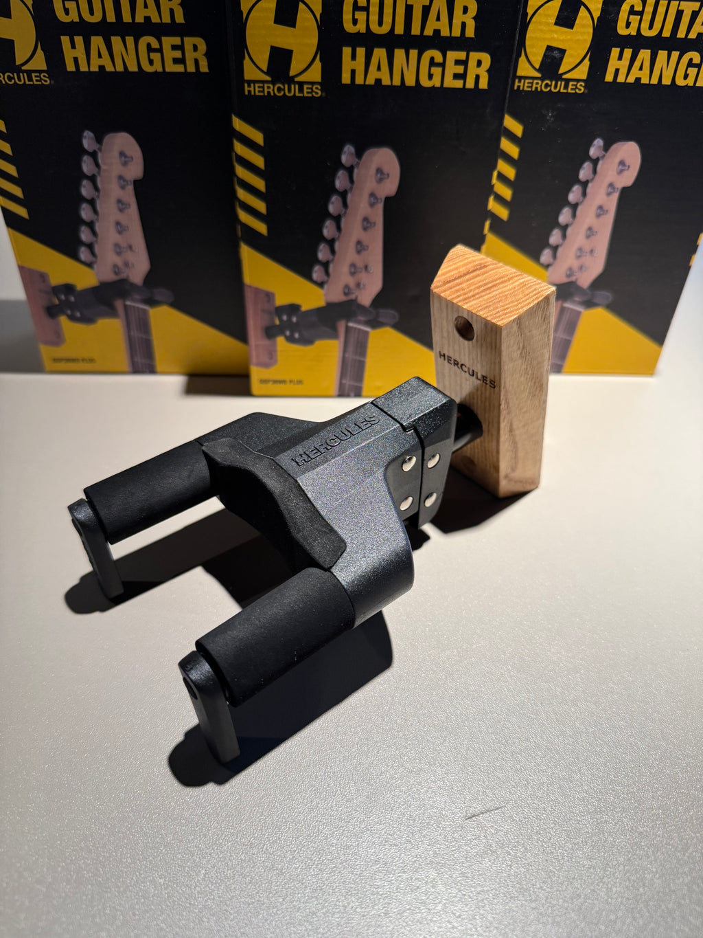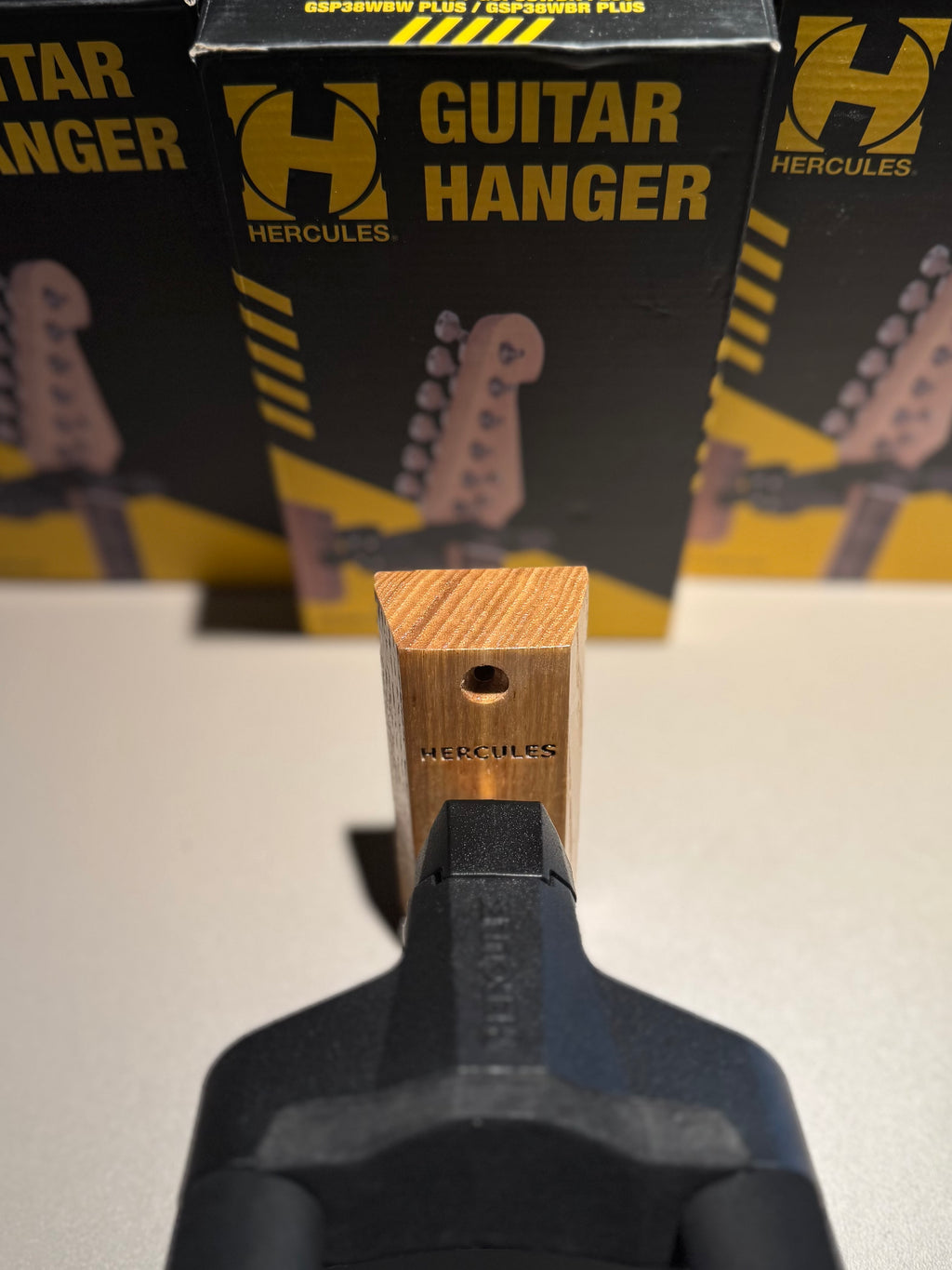 El colgador o base de pared de yugo giratorio automático HERCULES GSP38WBR PLUS gira automáticamente para acomodar guitarras o bajos de diferentes formas de forma vertical y segura.